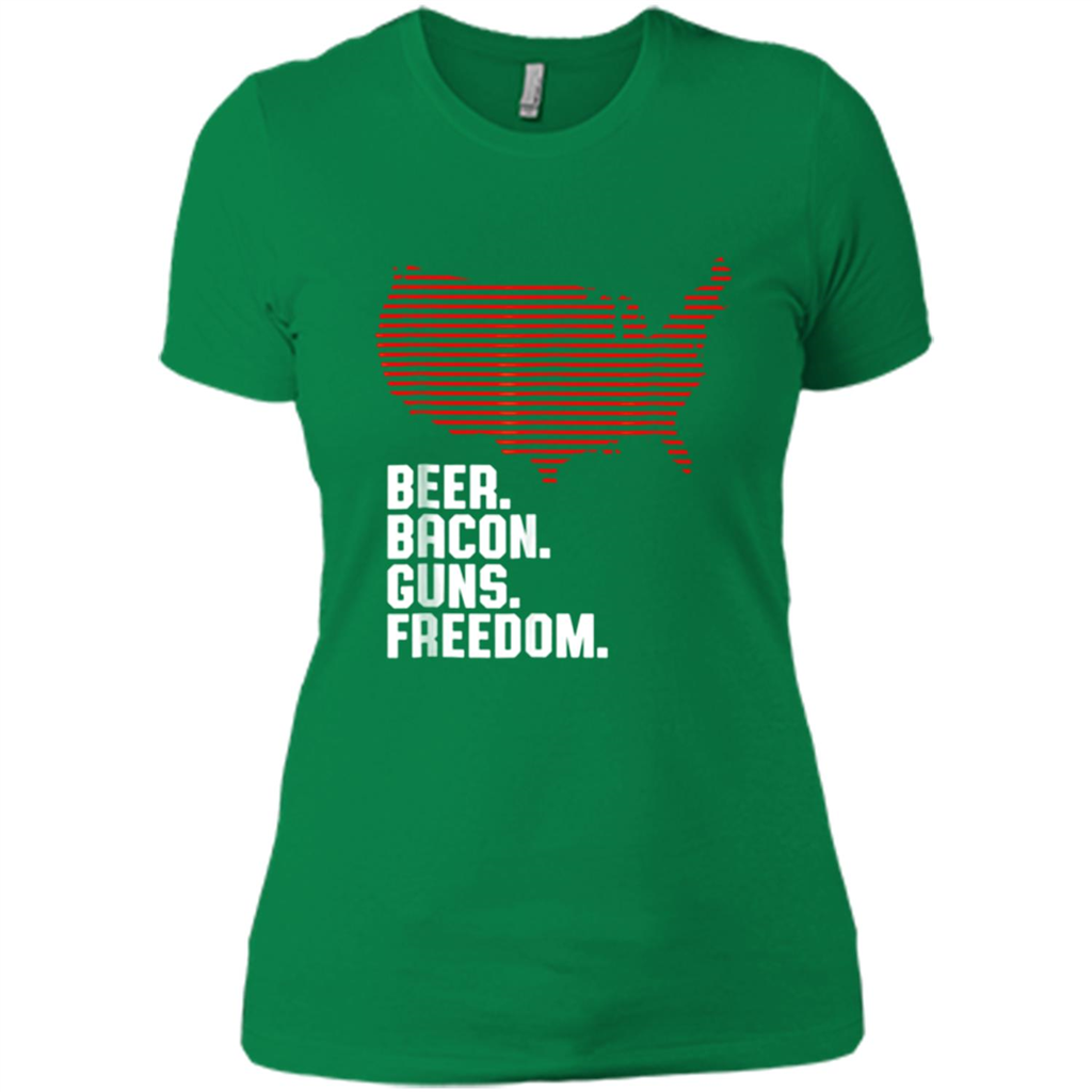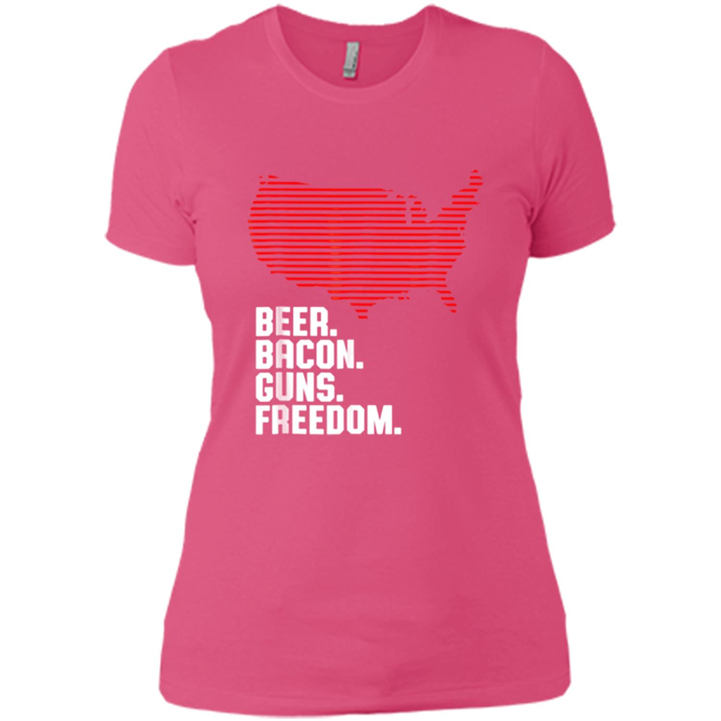 Our tees designed and printed in the USA. We use the highest grade plasticol ink and state of the art equipment to ensure vibrant colors and lasting durability. Professionally printed super soft funny and awesome tees. Our lightweight fitted tees are made from ultra soft ringspun cotton to get that comfortable fit and feel. Once you put this shirt on, you won't want to take it off. Larger sizes are available - 3XL 4XL and 5XL. If you are unsatisfied with the fit, we will provide an immediate exchange. Machine washable (wash inside out in cold water, hang dry). 4th of July Shirt Beer Bacon Guns Freedom - Ladies' Boyfriend T-Shirt
